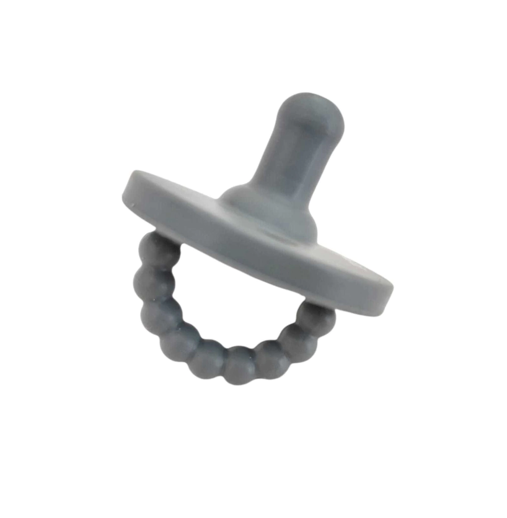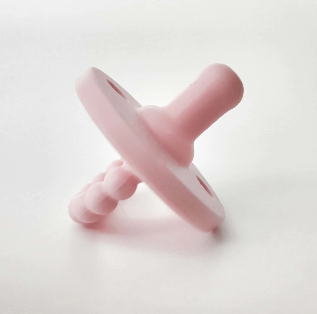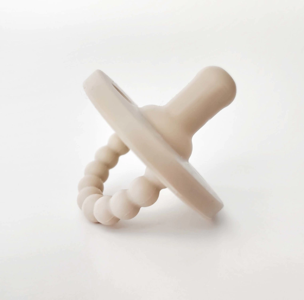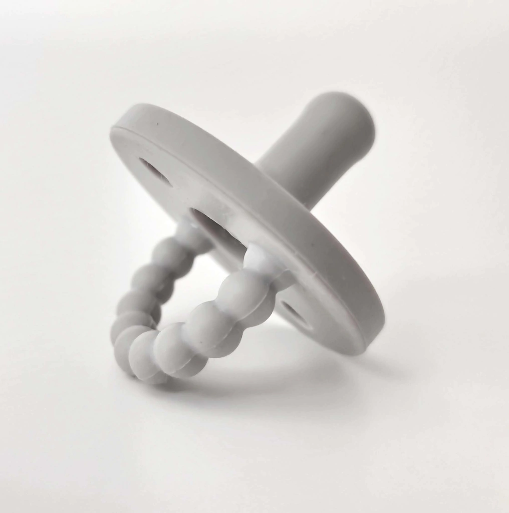 El chupete cuenta con una suave tetina redonda. El diseño de una pieza no tiene costuras, de extremo a extremo. Su gran escudo redondo imita el confort del pecho materno para calmar al bebé. Los orificios de respiración más grandes proporcionan una mayor ventilación. Se creó con un doble propósito: la parte del chupete se creó para calmar al bebé, y la parte del mordedor se desarrolló para ayudar a aliviar la dentición. BPA FREE.