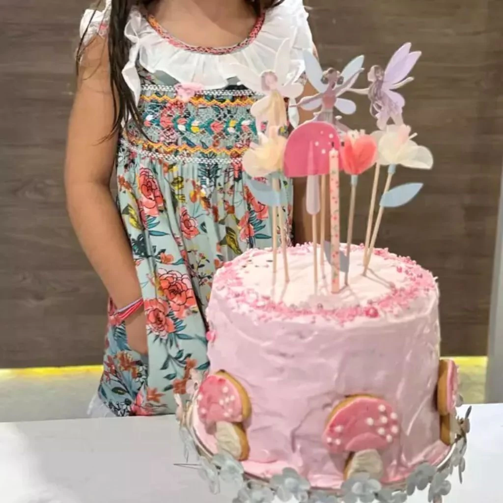 Vestido de tirantes anchos con volados blancos y falda amplia, confeccionado en tela estampada con flores rosas y verdes sobre fondo celeste. Lleva delicado bordado smock artesanal en el pecho, en tonos rosados, verdes y amarillos, que lo convierte en una prenda única y encantadora.