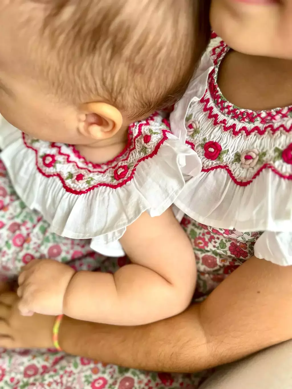 Vestido estampado en tonos rosa y verde, con bordado artesanal en el canesú y delicados volados en cuello, mangas y ruedo. Un diseño fresco y encantador para ocasiones especiales o el día a día con estilo.