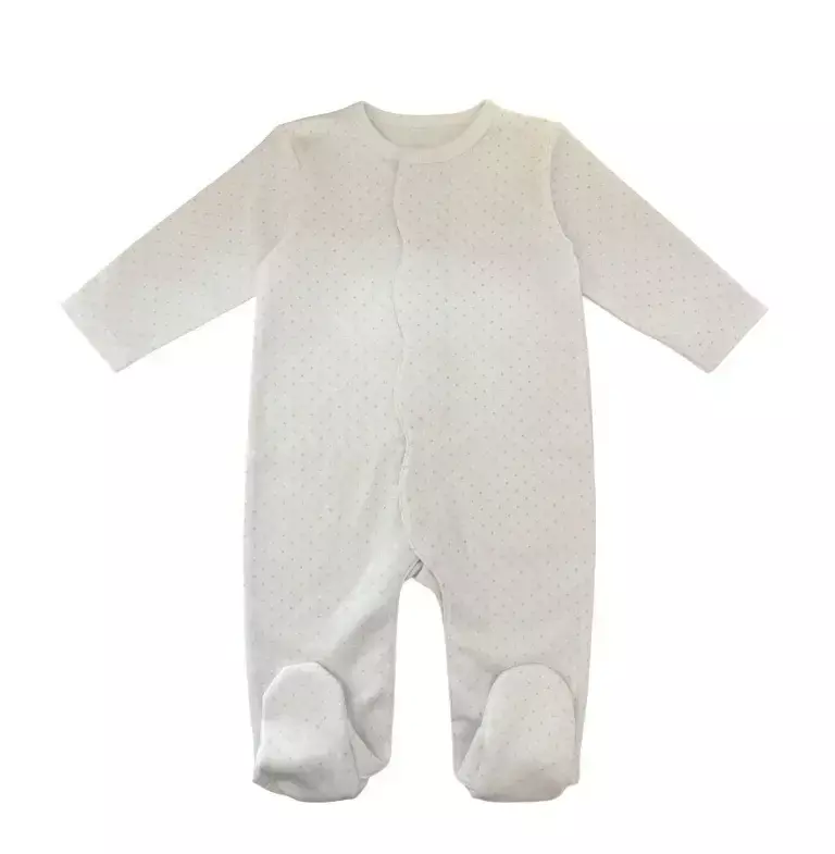 Enterito para bebé confeccionado en algodón pima peruano, de máxima suavidad y resistencia. Diseño blanco con pequeños lunares rosas, piecitos incluidos y broches delanteros para un fácil cambiado. Ideal para brindar comodidad y cuidado a la piel sensible del bebé.