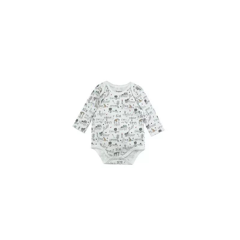 Body manga larga de algodón pima, suave y resistente, brindando comodidad todo el día. Con cuello americano y broches inferiores para un cambiado fácil. Estampado de animalitos y números.