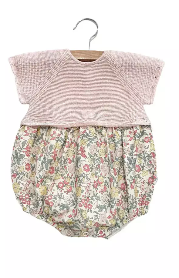 Bombachudo combinado con la parte superior tejida en punto suave y la parte inferior de algodón estampado liberty. Un diseño fresco y delicado, ideal para los días cálidos y lucir un look súper tierno.