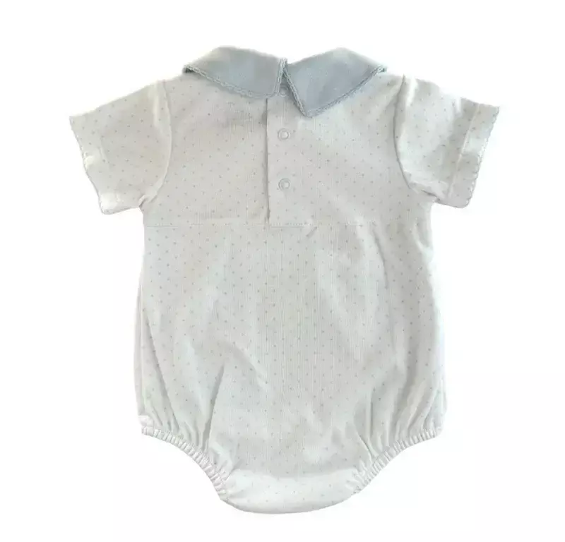 Bombachudo confeccionado en suave algodón pima, con delicado estampado de mini lunares y cuello bebé en tono celeste. Su diseño clásico y cómodo lo hace ideal para cualquier ocasión. Cierre con broches en la espalda y entrepierna para facilitar el cambio.